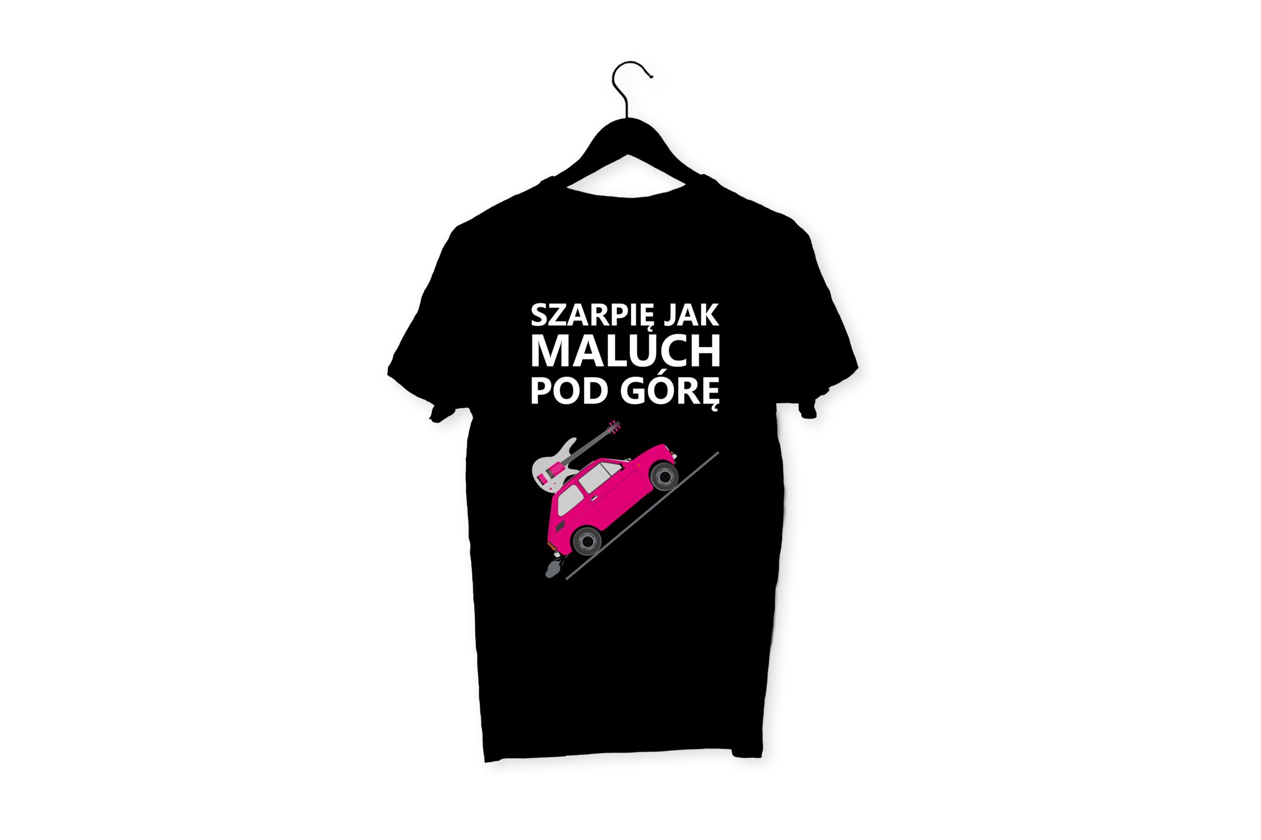Koszulka czarna z nadrukiem szarpię jak maluch pod górę – Indywidualny t-shirt z motywem fiata 126p z gitarą basową/elektryczną na dachu. Koszulka w kolorze czarnym wykonana z miękkiego materiału, który jest przyjemny w dotyku. Skład: 100% bawełna premium. Nadruk w technologi cyfrowej DTG zapewnia mocne i żywe kolory.